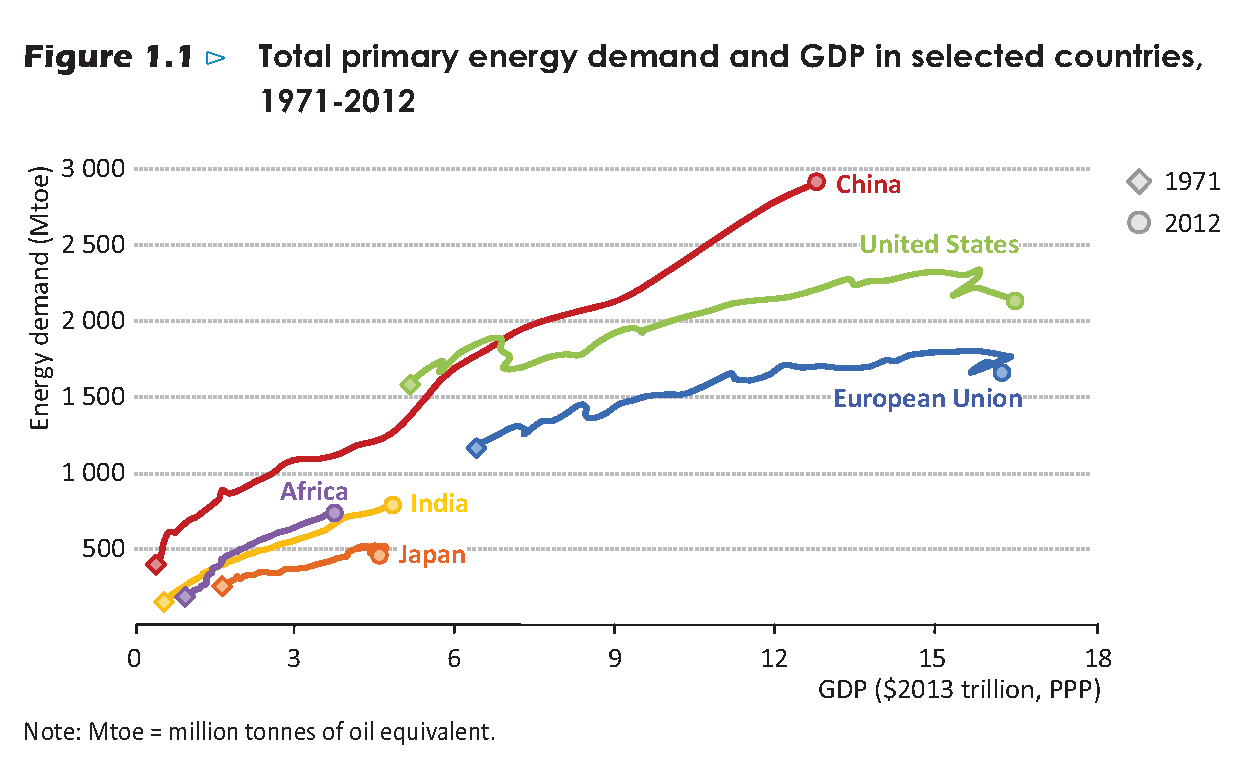 La cuestión está en qué consideramos BAU. A la vista de la gráfica, ¿China necesita un crecimiento constante en el consumo de energia? De momento parece ser que sí. ¿Y España (supongamos que la gráfica es como la azul de la EU)? Pues en el pasado sí, pero ahora parece que ya no... Me da pereza poner las gráficas, pero creo que no hace falta: tenemos actualmente un PIB más o menos como en el pico de la burbuja, y con un consumo energético no ya constante, sino bastante menor.