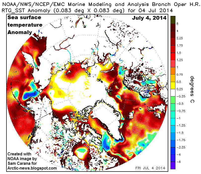 Tú no desconoces estas fuentes. Una bonita explicación sobre el JET STREAM la tienes en; http://arctic-news.blogspot.com.ar/2014/07/whats-wrong-with-the-weather.html Respecto al hielo ártico no confundas VOLUMEN con EXTENSION. Entiendo que lo que está cerca de los records mínimos es la EXTENSION. ![]() |